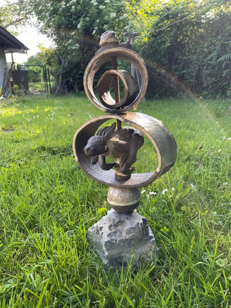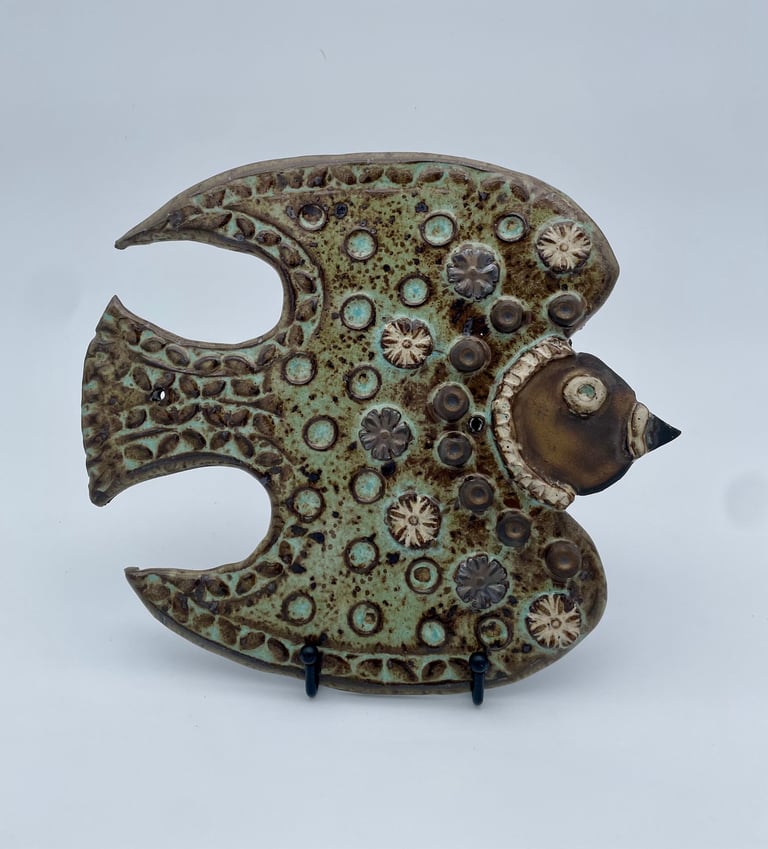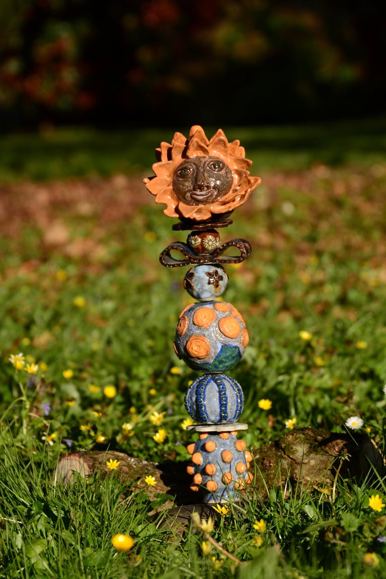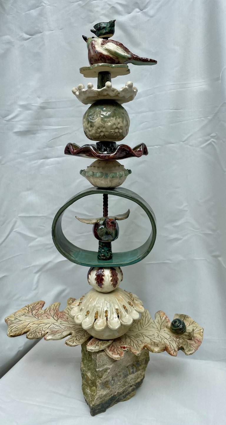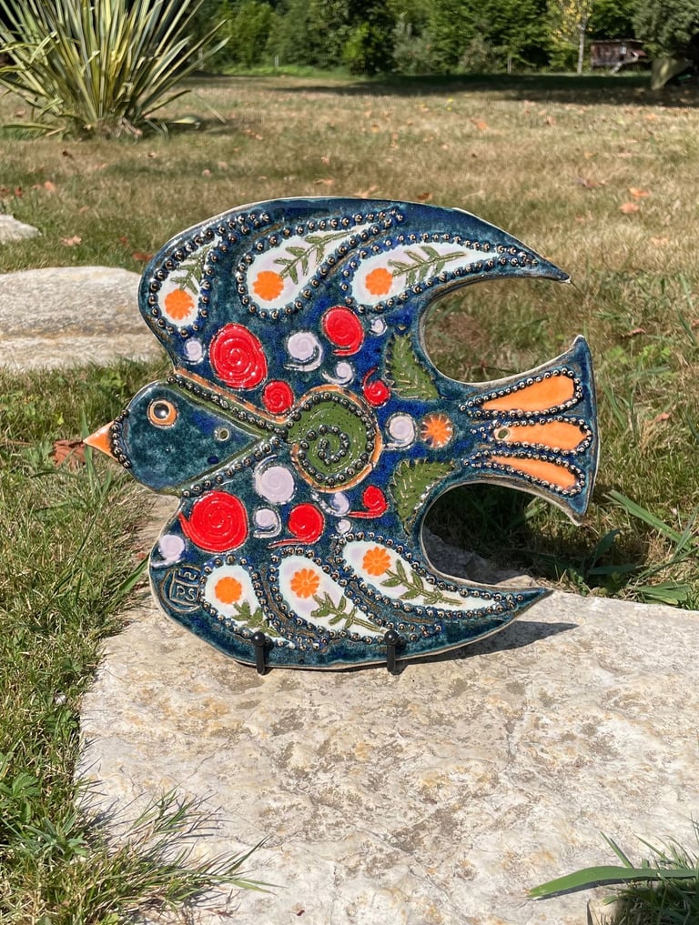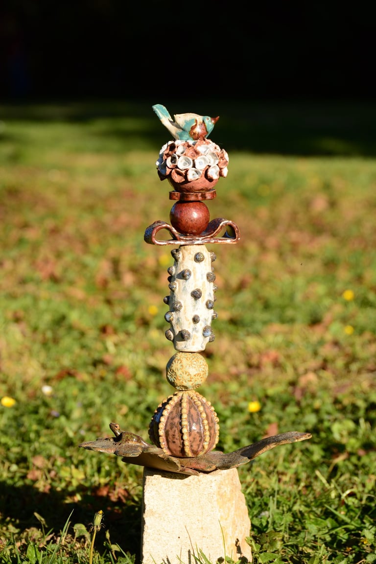 Totems en céramique, sculptures, oiseaux et poissons fantaisie