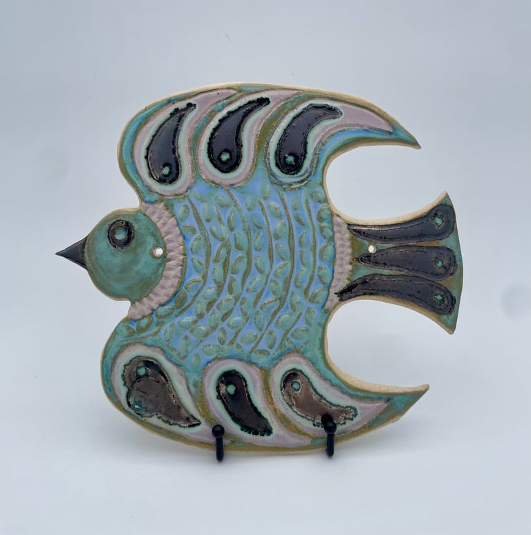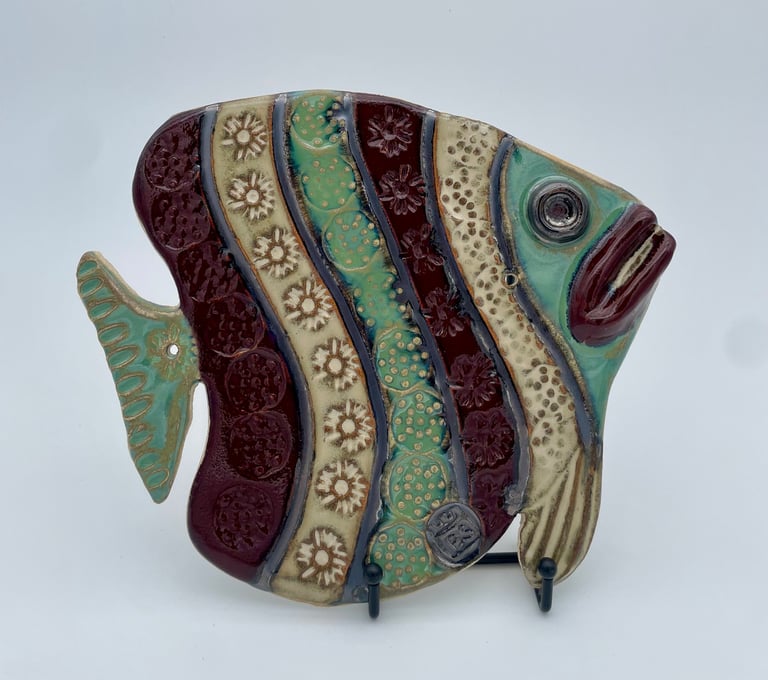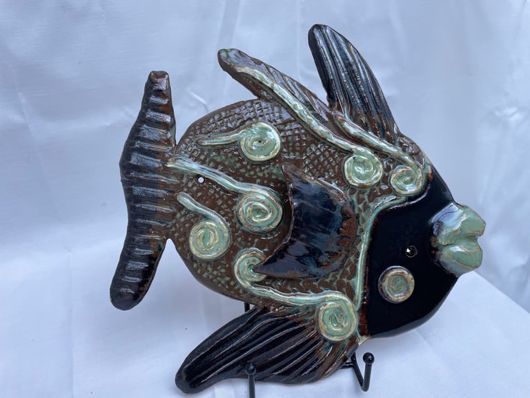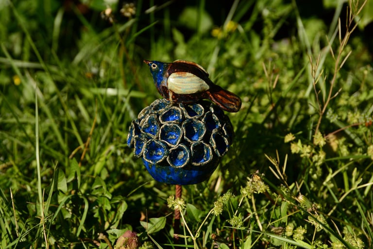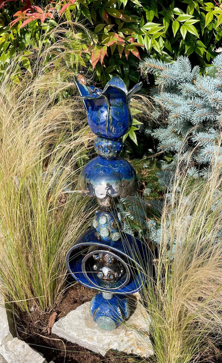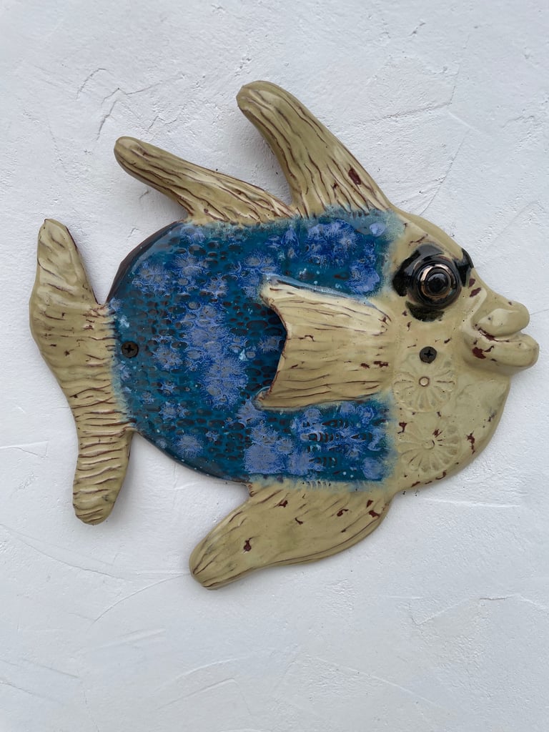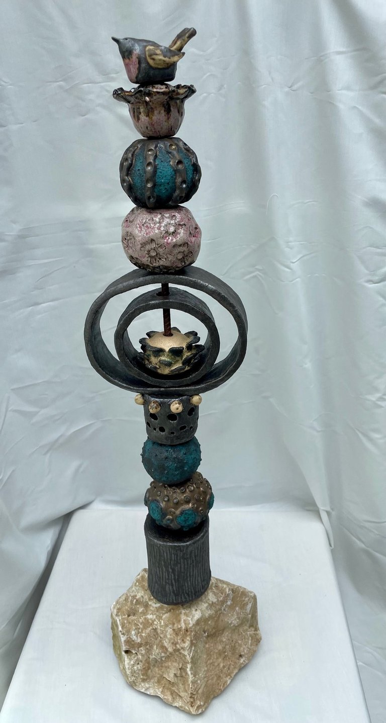 Totems en céramique, sculptures, oiseaux et poissons fantaisie