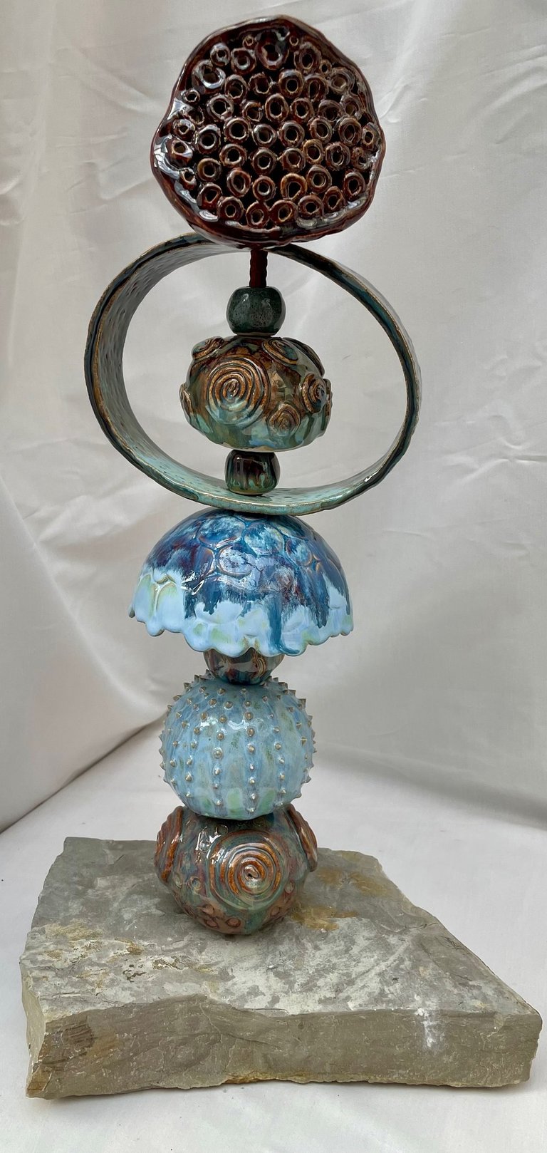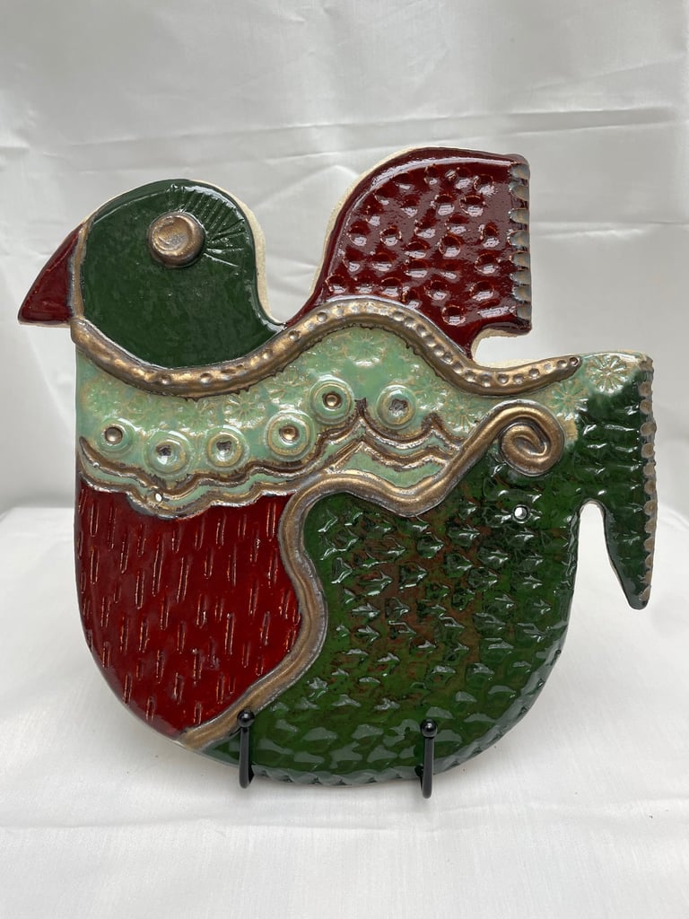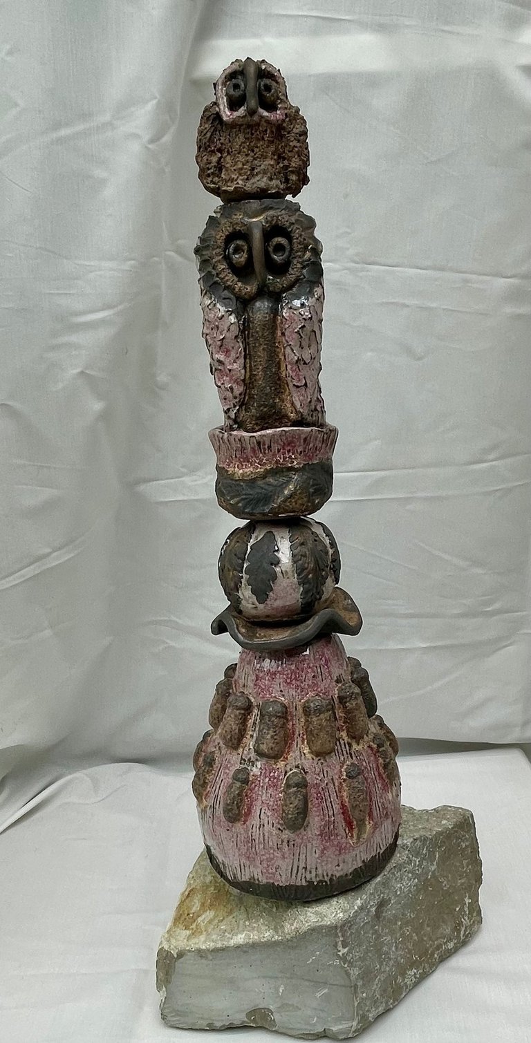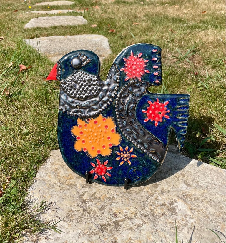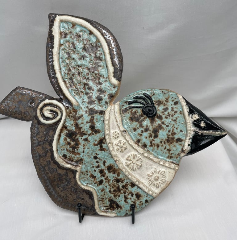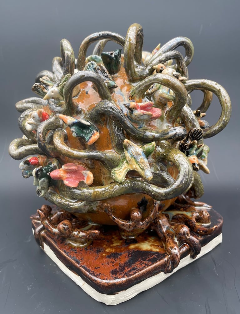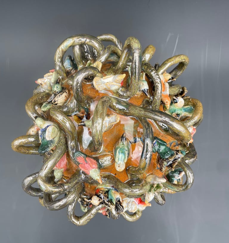 Totems en céramique, sculptures, oiseaux et poissons fantaisie
